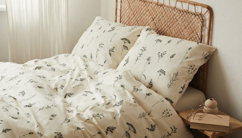 - Beż – najlepiej w połączeniu z surową tkaniną. Ten warunek spełnia pościel Polne rośliny z widocznymi łuskami bawełny na materiale.
