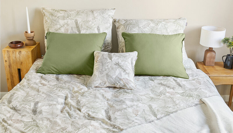 Bawełniana pościel w liście to prosty sposób na wieczorny relaks i głęboki sen. No bo co koi lepiej do natury? Spójrz tylko na bawełnianą pościel Leśne runo, na której znajdziesz paprocie, szyszki i gałęzie świerku. Ten wzór przeniesie Cię do lasu, a miękkie poszewki na poduszki sprawią, że nocny odpoczynek wejdzie na wyższy poziom. Dodaj do tego niebieloną bawełnę z charakterystycznymi łuskami materiału. To naturalna pościel nie tylko pod względem zdobienia, ale również materiału.