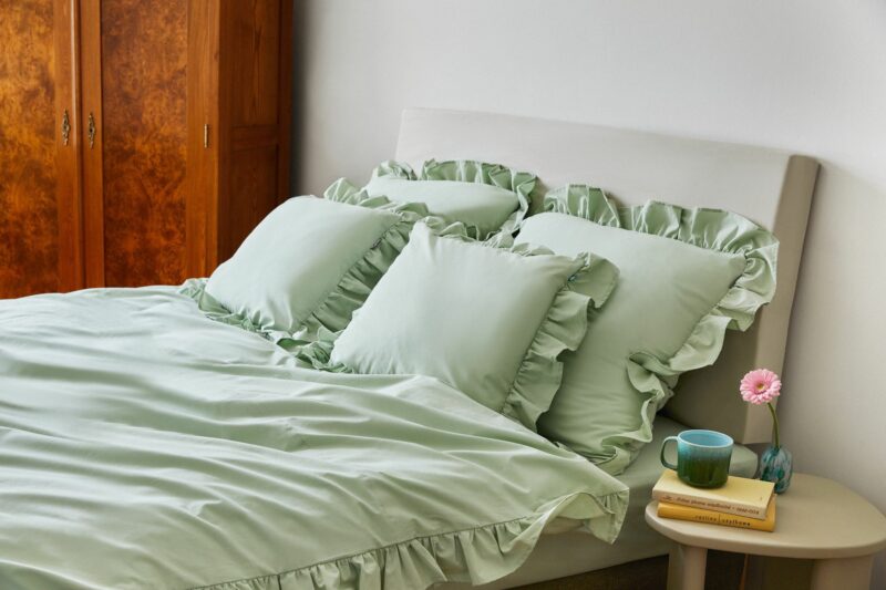 Kolorowa pościel z bawełny? Takie komplety również kupisz w sklepie internetowym MUMLA. Pościel pistacjowa z falbaną jest niebanalna, energetyczna i idealna na wiosnę. Podobnie jak wersja w odcieniu brudnego różu. Do pościeli z bawełny możesz dodać równie piękne dekoracyjne poduszki. Na przykład błękitną poszewkę z falbaną.