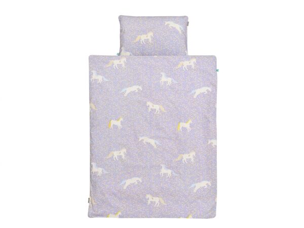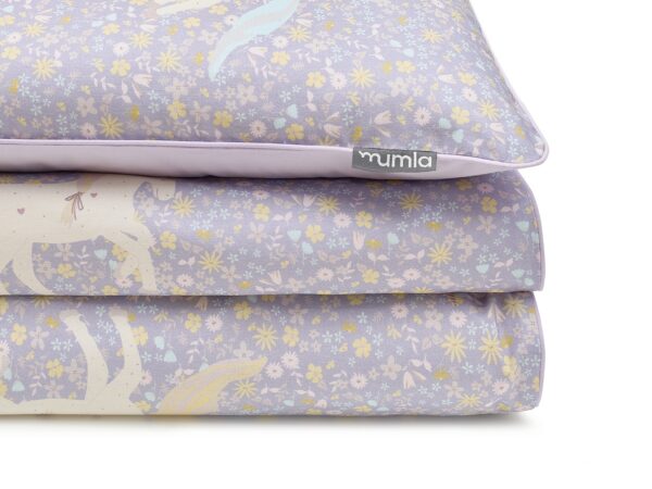 Jednorożce to jeden z najpopularniejszych dziecięcych motywów, zwłaszcza wśród dziewczynek. Nie mogło zabraknąć go również u nas! Stworzyliśmy bawełnianą pościel Jednorożce. Te fantastyczne stworzenia występują na niej w otoczeniu drobnych kwiatków, w pastelowych kolorach. Tył pościeli jest jednolity, lawendowy. W takiej wersji jest to idealna pościel dla dziewczynki. Będzie pasować nie tylko do różowych i fioletowych pokoików. Może być słodkim akcentem w neutralnym wnętrzu. Na białym lub drewnianym łóżku będzie pięknie się prezentować.